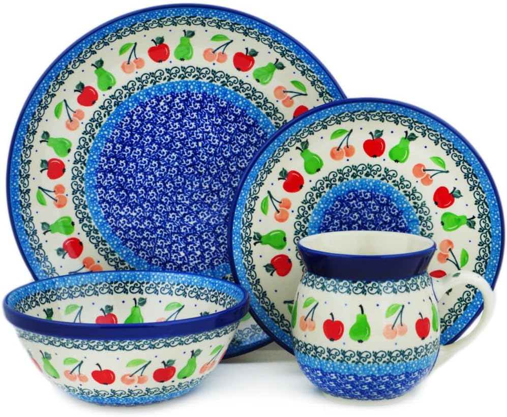 Genuine Polish Pottery handmade in Boleslawiec, Poland. Region celebrated for its long-standing ceramic tradition and artisanal craftsmanship.This authentic, hand-painted Polish stoneware 4pc Place Setting in the Red April Showers pattern is handcrafted by Ceramika Artystyczna using traditional hand-painting and high-temperature firing techniques for lasting durability and everyday functionality.Certificate of Authenticity:Includes an official certificate verifying the handmade origin and authenticity of the piece.Care Instructions:Your order includes care instructions and helpful information, especially useful when gifting Polish Pottery.Set Includes:Dinner Plate 10 1/2 Inch, Dessert Plate 7 1/2 Inch, Bowl 6 1/2 Inch, Bubble Mug 16 ozCertified Polmedia Polish Pottery Features:* Lead & Cadmium Free: Safe for everyday use.* Microwave Safe: Heat food or drinks with confidence.* Dishwasher Safe: Pattern will not fade.* Oven Safe (up to 480F): Excellent for baking and reheating.* Freezer Safe: High-fired stoneware handles temperature changes.* Chip & Scratch Resistant: Durable for daily use.* Hand-Painted Artistry: Decorated by skilled artisans.* Never-Fade Colors: Patterns remain vibrant forever.The Essence of Polish Pottery:For generations, artisans in Boleslawiec have crafted stoneware valued for durability, heat distribution, and long-lasting beauty. This tradition continues today in every piece of Polish Pottery.